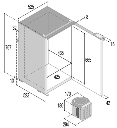 El frigorífico-congelador C130L CHR, perteneciente a la serie Chromelock, es una opción ideal que ofrece una capacidad total de 130 litros, de los cuales 17,1 litros pueden destinarse al compartimento del congelador, si se selecciona esta configuración. La unidad de refrigeración se encuentra instalada externamente.
